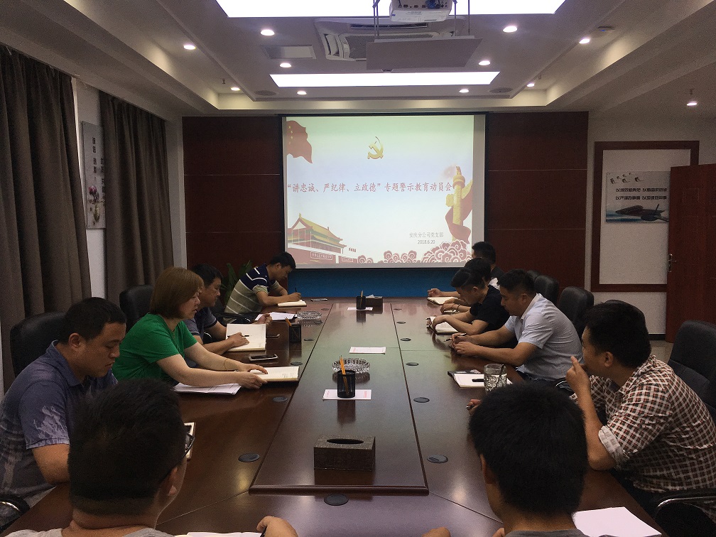 6月20日下午,安慶分公司黨支部召開了“講忠誠、嚴(yán)紀(jì)律、立政德”專題警示教育動(dòng)員擴(kuò)大會(huì)議,分公司全體員工參加動(dòng)員會(huì)。