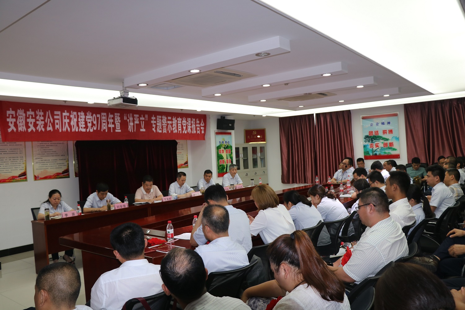 為慶祝中國共產(chǎn)黨建黨97周年,扎實開展好“講忠誠、嚴紀(jì)律、立政德”專題警示教育,推動全面從嚴治黨向縱深發(fā)展。7月4日下午,安徽安裝公司黨委召開慶祝建黨97周年暨“講嚴立”專題警示教育黨課報告會。公司黨委書記、副總經(jīng)理胡六中作了題為《講忠誠 嚴紀(jì)律 立政德 做新時代合格共產(chǎn)黨員》的黨課報告。公司董事長、總經(jīng)理、黨委副書記王軍邦主持會議并宣貫集團公司慶祝建黨97周年暨黨的建設(shè)工作會議精神。黨委委員、副總經(jīng)理劉安俊宣讀表彰決定。公司領(lǐng)導(dǎo)班子成員、機關(guān)部門正副職、機關(guān)在崗黨員、分公司領(lǐng)導(dǎo)班子成員和受表彰的先進基層黨組織、優(yōu)秀共產(chǎn)黨員和優(yōu)秀黨務(wù)工作者共70余人參加會議。