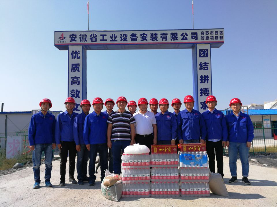 2018年7月21日下午,公司董事長、總經(jīng)理、黨委副書記王軍邦、總會計師張元斌頂著烈日驕陽在公司總經(jīng)理助理、西北分公司經(jīng)理、新疆辦事處主任、項目經(jīng)理王軍的陪同下,深入新疆烏蘇市西區(qū)管廊工程項目部,為堅守在一線的員工送去礦泉水、綠豆、蕎麥、冰糖、藿香正氣水等防暑降溫慰問品。