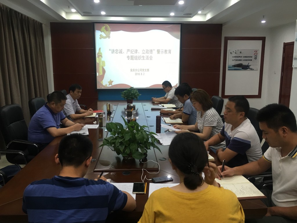 8月2日下午,安慶分公司黨支部組織召開了“講忠誠、嚴紀律、立政德”警示教育專題組織生活會,公司董事長、總經(jīng)理、黨委副書記王軍邦,紀委書記、工會主席李寬旭到會指導。分公司領導班子成員、支部黨員參加了會議,會議由分公司黨支部書記劉紅艷主持。