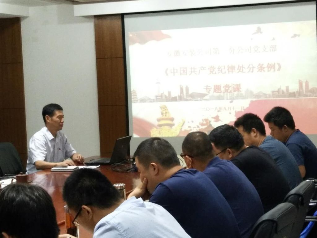 9月11日,第一分公司黨支部開展“黨支部書記上黨課”主題黨日活動。分公司黨支部書記胡迎東以新修訂的《中國共產(chǎn)黨紀(jì)律處分條例》為主題,采用PPT的形式為全體黨員、分公司領(lǐng)導(dǎo)班子成員、機(jī)關(guān)部門負(fù)責(zé)人、在肥項(xiàng)目經(jīng)理上了一堂生動的黨課。