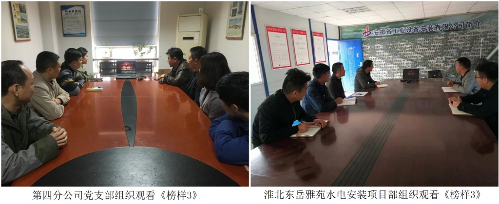 為深入學(xué)習(xí)貫徹習(xí)近平新時(shí)代中國特色社會主義思想和黨的十九大精神,深入推進(jìn)“兩學(xué)一做”學(xué)習(xí)教育常態(tài)化制度化,樹立優(yōu)秀共產(chǎn)黨員楷模,發(fā)揮先進(jìn)典型示范作用,按照《中共安徽省委組織部關(guān)于認(rèn)真做好<榜樣3>專題節(jié)目學(xué)習(xí)宣傳工作的通知》要求,近日,安徽安裝公司組織各黨支部、項(xiàng)目部黨員干部職工集中觀看《榜樣3》專題節(jié)目。