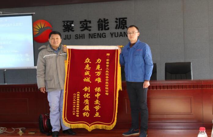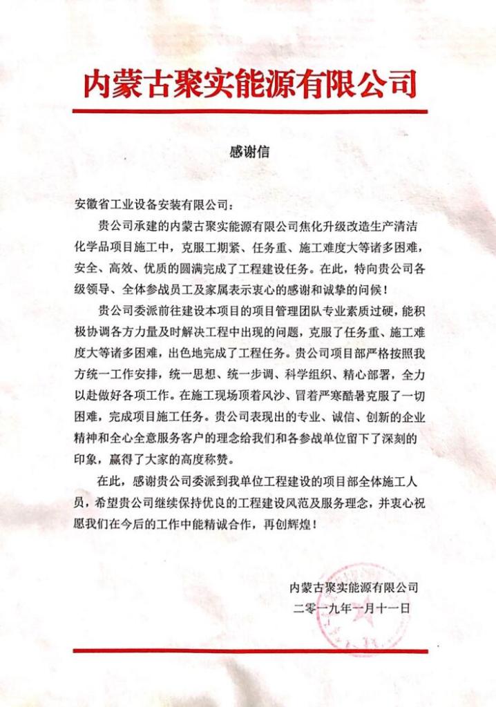 2019年1月14日,安徽安裝承建的內(nèi)蒙古聚實(shí)能源有限公司焦化升級(jí)改造生產(chǎn)清潔化學(xué)品項(xiàng)目,克服工期緊、任務(wù)重、施工難度大等諸多困難,安全、高效、優(yōu)質(zhì)的圓滿(mǎn)完成了工程建設(shè)任務(wù)。業(yè)主內(nèi)蒙古聚實(shí)能源公司總經(jīng)理張春軍向公司贈(zèng)送內(nèi)容為“力克萬(wàn)難 保中交節(jié)點(diǎn);眾志成城 創(chuàng)優(yōu)質(zhì)履約”的錦旗。