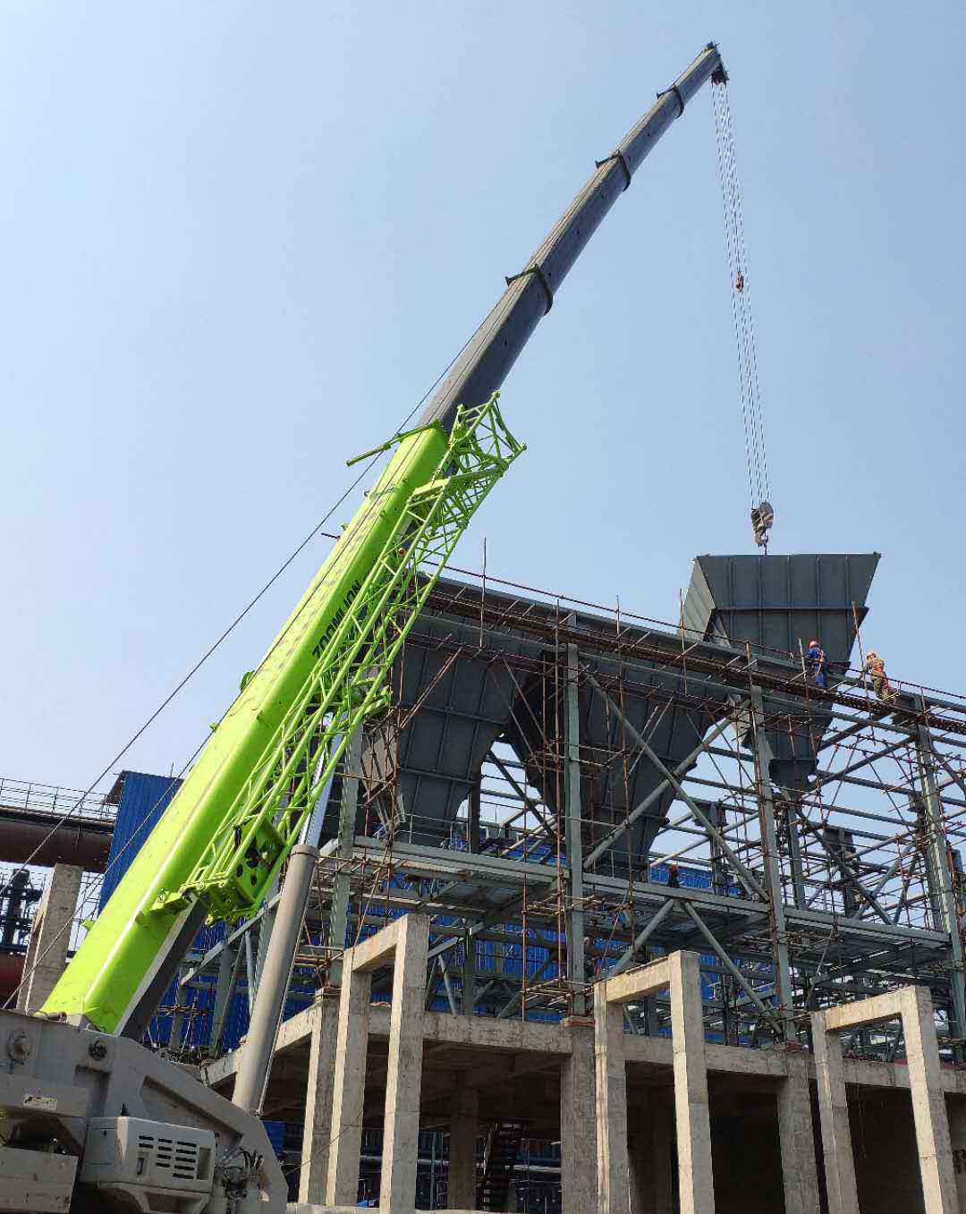本次吊裝的反應(yīng)器灰斗部分總重量達(dá)56噸,吊裝作業(yè)存在場(chǎng)地狹小、與土建單位交叉作業(yè)多、吊重荷載大等諸多困難,吊裝任務(wù)異常艱巨。為此,項(xiàng)目部提前合理部署,多次優(yōu)化吊裝方案,按照方案要求采用額定荷載為100噸的汽車實(shí)施吊裝作業(yè)。項(xiàng)目部在設(shè)備吊裝前對(duì)全體“參戰(zhàn)”人員進(jìn)行了現(xiàn)場(chǎng)安全技術(shù)交底,明確施工工序、技術(shù)要點(diǎn)難點(diǎn)和安全風(fēng)險(xiǎn)點(diǎn),做到分工明確、責(zé)任到位,吊裝工作有條不紊地展開。在各方力量的通力配合下,經(jīng)過(guò)六個(gè)多小時(shí)的奮戰(zhàn),項(xiàng)目部終于完成了10臺(tái)灰斗以及現(xiàn)場(chǎng)輔助設(shè)備的吊裝任務(wù)。