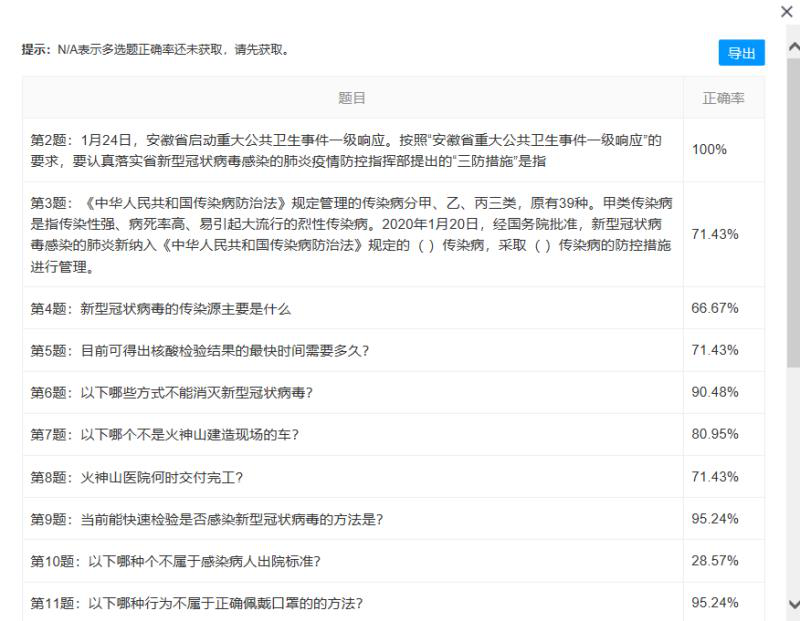 本次疫情防控知識(shí)答題通過(guò)在分公司微信群發(fā)送答題鏈接開(kāi)展,內(nèi)容涵蓋新冠肺炎基本知識(shí)、疫情防控措施、員工居家防控等多項(xiàng)內(nèi)容,同時(shí)還對(duì)上級(jí)在疫情期間下發(fā)的各類疫情防控工作指導(dǎo)意見(jiàn)、措施等進(jìn)行了宣貫。此次活動(dòng),員工參與率達(dá)到了100%,不僅加強(qiáng)了員工對(duì)防疫知識(shí)的了解,還提高了預(yù)防疾病自我保護(hù)的意識(shí),防疫知識(shí)掌握情況總體較好。通過(guò)參與答題,廣大員工進(jìn)一步了解了新冠肺炎的傳播途徑及相關(guān)防護(hù)措施,表示要努力做到認(rèn)真理性對(duì)待疫情,保持良好個(gè)人生活習(xí)慣和公共衛(wèi)生習(xí)慣,遵守疫情防控工作要求,胸懷全局、統(tǒng)一思想,堅(jiān)決打贏疫情防控阻擊戰(zhàn)。