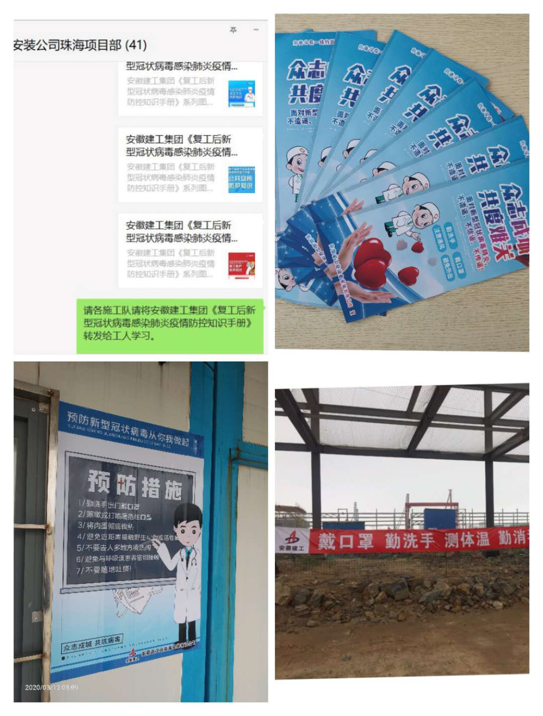 做好疫情宣傳,做好疫情指導(dǎo)。項目部通過微信群、印制宣傳手冊、懸掛條幅等提高防控意識,形成全員重視自身防護的良好氛圍。