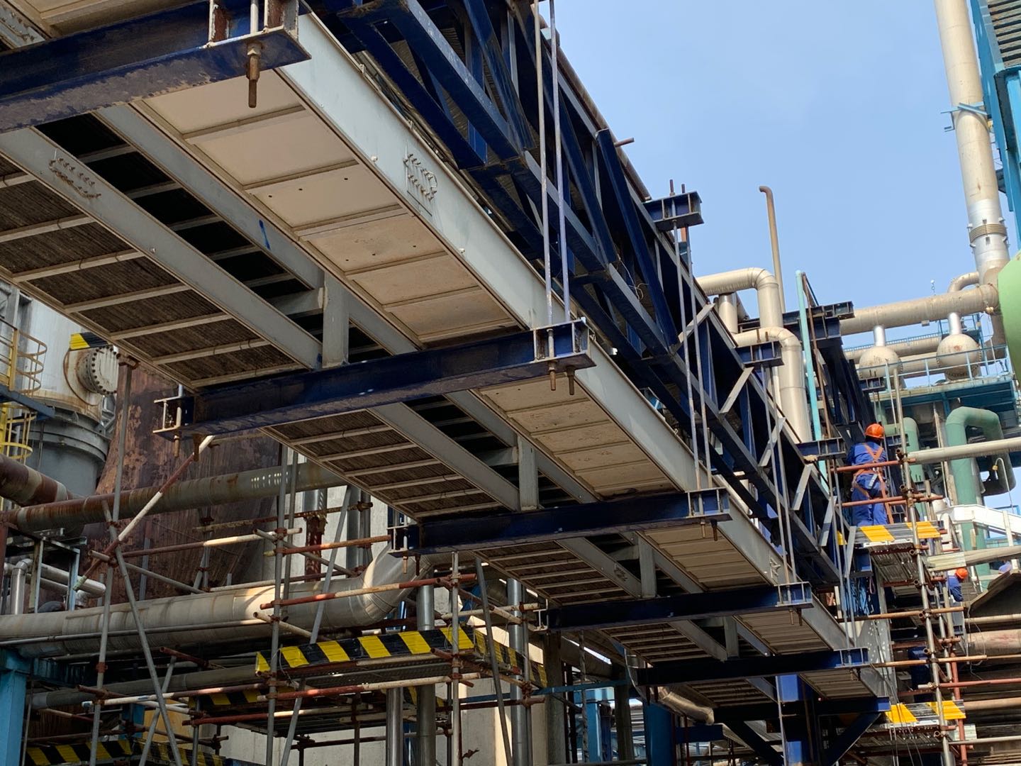 “Ⅰ、Ⅱ硫磺回收裝置增設(shè)煙氣后堿洗流程項目”是能使煙氣SO2排放濃度從原先的50mg/m3下降至≤10mg/m3的環(huán)保工程。但該項工程僅一個脫硫塔下段就高達(dá)33米,重達(dá)58噸,體積十分龐大,而現(xiàn)場存在作業(yè)場地狹小,固有障礙物多、吊重荷載大等諸多問題,無法將設(shè)備一次性運至施工現(xiàn)場并進(jìn)行下段焊接梯子、平臺等附塔“穿衣戴帽”作業(yè)。對此,項目部多次優(yōu)化倒運方案,提前合理部署,采用額定荷載分別為220噸和90噸的汽車吊實施雙機(jī)抬吊作業(yè)和專為公路橋梁設(shè)計使用的炮車運輸,從而順利完成了倒運工作。同時,為爭取時間,安排班組實行夜間倒班制,管理人員輪班制,為接下來的脫硫塔“穿衣戴帽”和上下段空中組對焊接作業(yè)爭取了寶貴時間。