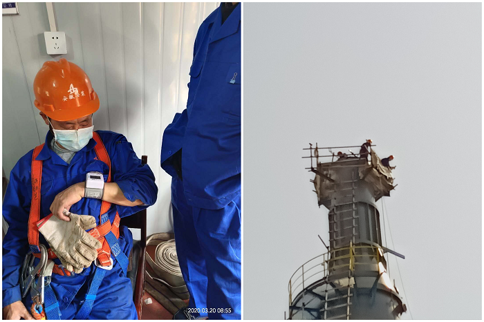 面對(duì)Ⅲ級(jí)高空作業(yè),項(xiàng)目部從對(duì)登塔作業(yè)人員的篩選開始就不敢有半點(diǎn)大意,除了項(xiàng)目技術(shù)負(fù)責(zé)人、安全負(fù)責(zé)人分別進(jìn)行技術(shù)和安全交底外,還仔細(xì)檢查了登塔人員體檢報(bào)告,并在登塔作業(yè)前逐一對(duì)其進(jìn)行血壓測(cè)量,確保高處作業(yè)人員身體狀況穩(wěn)定。同時(shí),配備對(duì)講機(jī),保障上下作業(yè)人員密切配合,順利吊裝,還要對(duì)作業(yè)平臺(tái)和周圍區(qū)域滿鋪防火布,設(shè)置接火盆,避免塔體下方易燃易爆風(fēng)險(xiǎn),以此杜微慎防,確保萬無一失。11時(shí)28分,脫硫塔上段吊裝正式開始。在場(chǎng)人員個(gè)個(gè)屏息凝神,目光隨著脫硫塔一起移動(dòng),思緒跟著脫硫塔一起飆高,“慢慢的...升一點(diǎn)...往西偏一點(diǎn)點(diǎn)...好!停!...降,慢一點(diǎn)...降降降,好!”終于完成上段吊裝環(huán)節(jié)作業(yè),所有人懸著的心都放下來了,但是任務(wù)還沒徹底完成,接下來就是更重要的對(duì)口、焊接環(huán)節(jié)。由于要進(jìn)入塔內(nèi)進(jìn)行對(duì)口焊接,為了保障作業(yè)人員的生命安全,配備氣體檢測(cè)儀,以測(cè)量塔內(nèi)氧氣濃度是否正常,無硫化氫和可燃性氣體是否超標(biāo)。