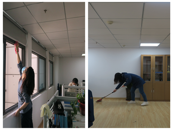 風和日麗,大家早早的來到辦公室,三五一組,相互配合,擼起袖子加油干。開窗通風、地面清掃、消毒殺菌、門窗擦拭、書柜整理、綠植澆灌、垃圾傾倒……大家熱情高漲、干勁十足,仔仔細細清理著每個角落,不遺漏任何一個死角。經過半個多小時的辛勤勞動,辦公區(qū)域頓時變得更加清新明亮、干凈整潔,不由得令人耳目一新、賞心悅目。隨后,分公司文明衛(wèi)生檢查組還對各部門的衛(wèi)生情況進行了嚴格打分,并對檢查結果進行了通報。