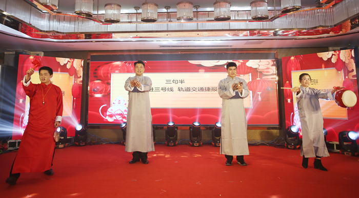 整場聯(lián)歡會由歌伴舞、朗誦、合唱、小品、樂器演奏、三句半、黃梅戲、音詩畫等16個節(jié)目組成,均為職工自編自導(dǎo)自演。在歌伴舞《今天是你的生日中》中,聯(lián)歡會正式拉開序幕?!妒“操潯芬愿木幇纥S梅戲劇的形式為公司送上美好的祝愿;配樂詩朗誦《春風(fēng)浩蕩啟新程,揚帆起航再出發(fā)》展現(xiàn)了安徽安裝人團結(jié)奮進,一往無前的精神風(fēng)貌;三句半《拼搏奮進三號線,軌道交通捷報傳》以幽默的方式講述了軌道交通3號線合肥大劇院站項目部上的故事;音詩畫《奮斗是青春最亮麗的底色》講述了新疆烏蘇管廊、中水回用項目榮獲“安徽省工人先鋒號”背后的故事,向全體奮戰(zhàn)在項目施工一線的安徽安裝人致敬...歡快的旋律,優(yōu)美的舞姿,幽默的小品,豪邁的朗誦將現(xiàn)場的氣氛推向高潮,贏得了現(xiàn)場觀眾的歡呼喝彩與陣陣掌聲。