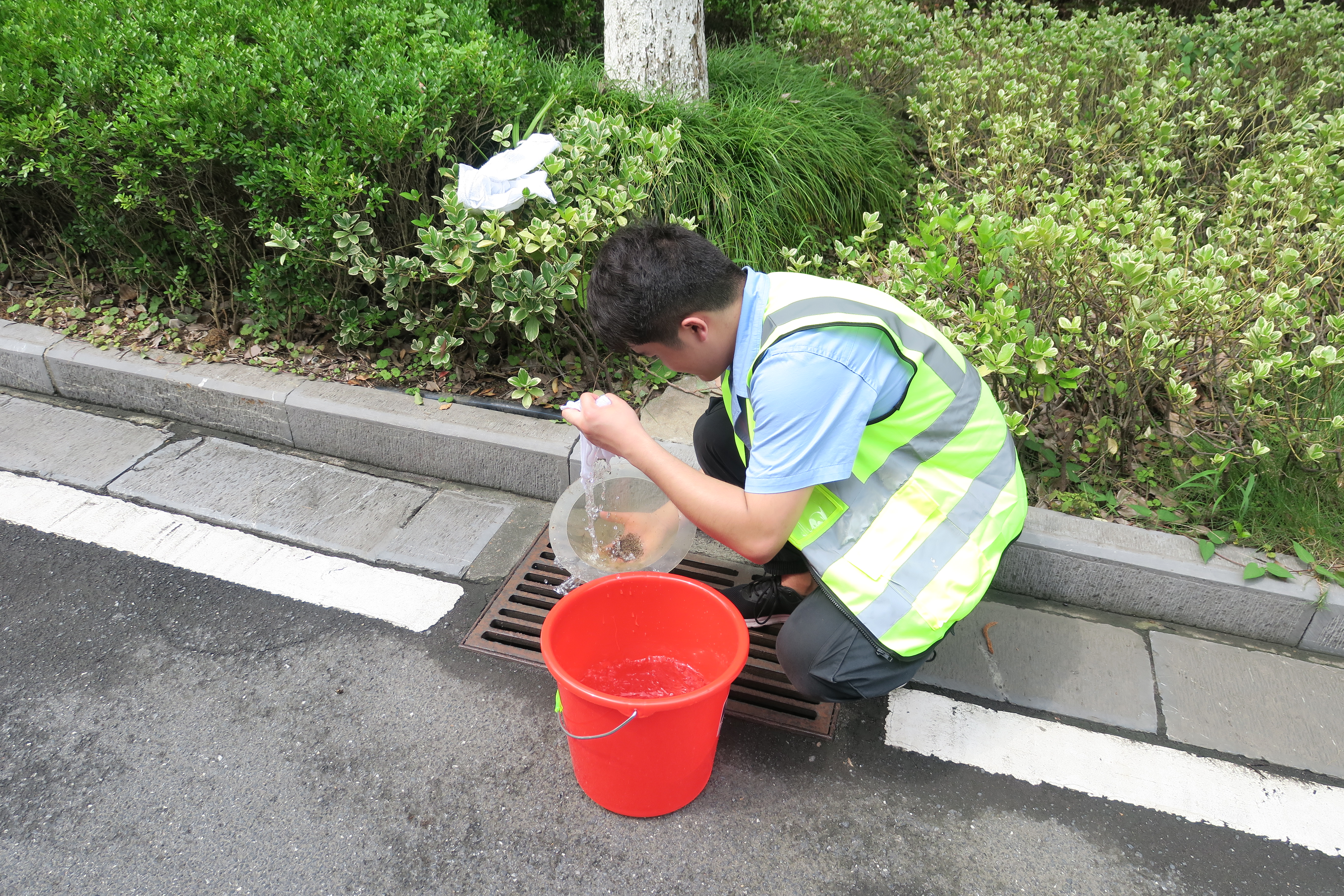 到達(dá)項目現(xiàn)場后,大家迅速分組,每組都由一名有施工經(jīng)驗的老員工帶領(lǐng)。在項目部負(fù)責(zé)人的統(tǒng)一指揮下,大家?guī)Ш冒踩o(hù)具和工作用具,進(jìn)入施工現(xiàn)場開始了緊張的勞動。此時室外氣溫達(dá)到38攝氏度,但大家絲毫不懈怠、不畏懼,頭頂烈日為路燈刷油漆、洗燈罩、換燈泡,竭心盡力的完成各項工作。