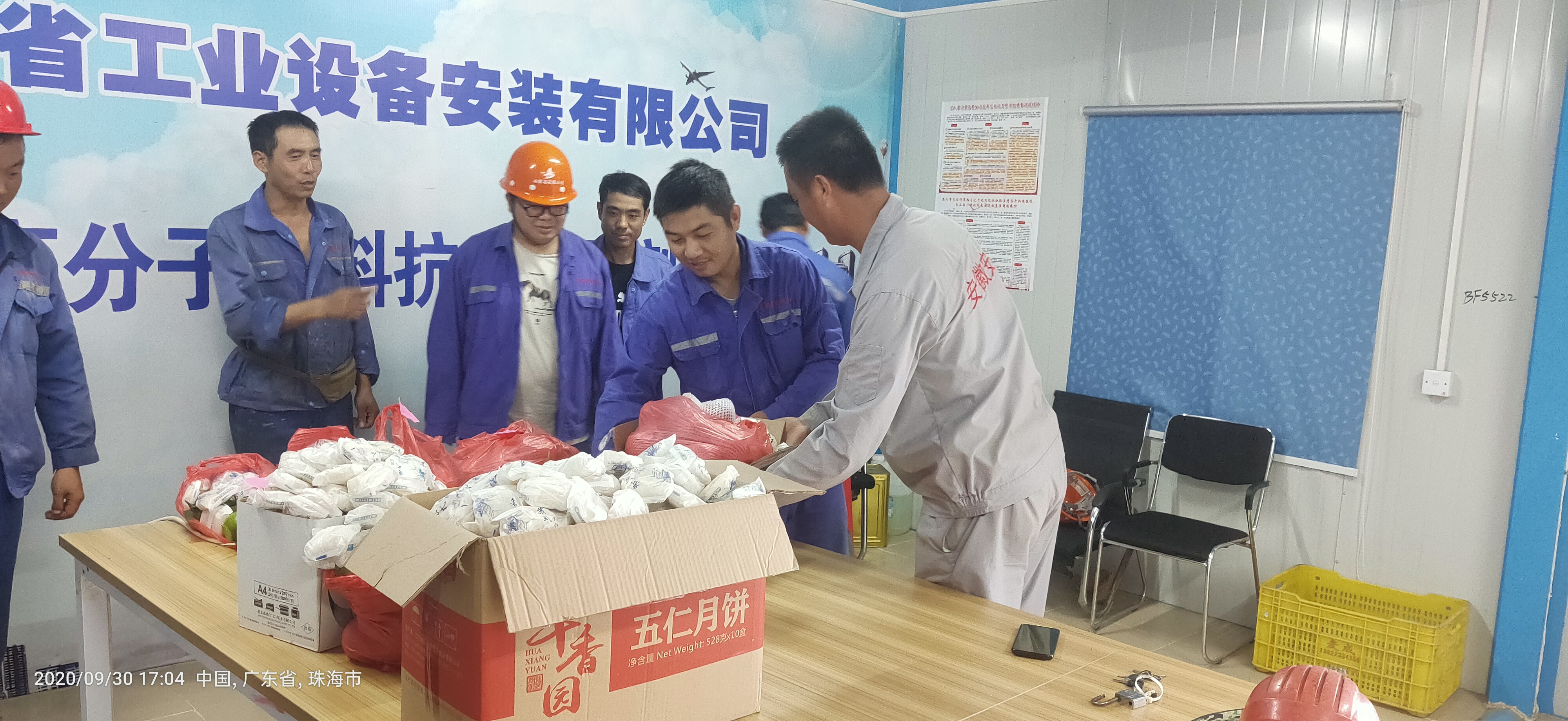 9月30日,在2020年中秋節(jié)國慶節(jié)“雙節(jié)”來臨之際,西北分公司珠海利安隆項(xiàng)目部組織開展了“雙節(jié)”送溫暖活動(dòng)——為仍奮斗在一線項(xiàng)目建設(shè)者們送上了一份節(jié)日的祝福。