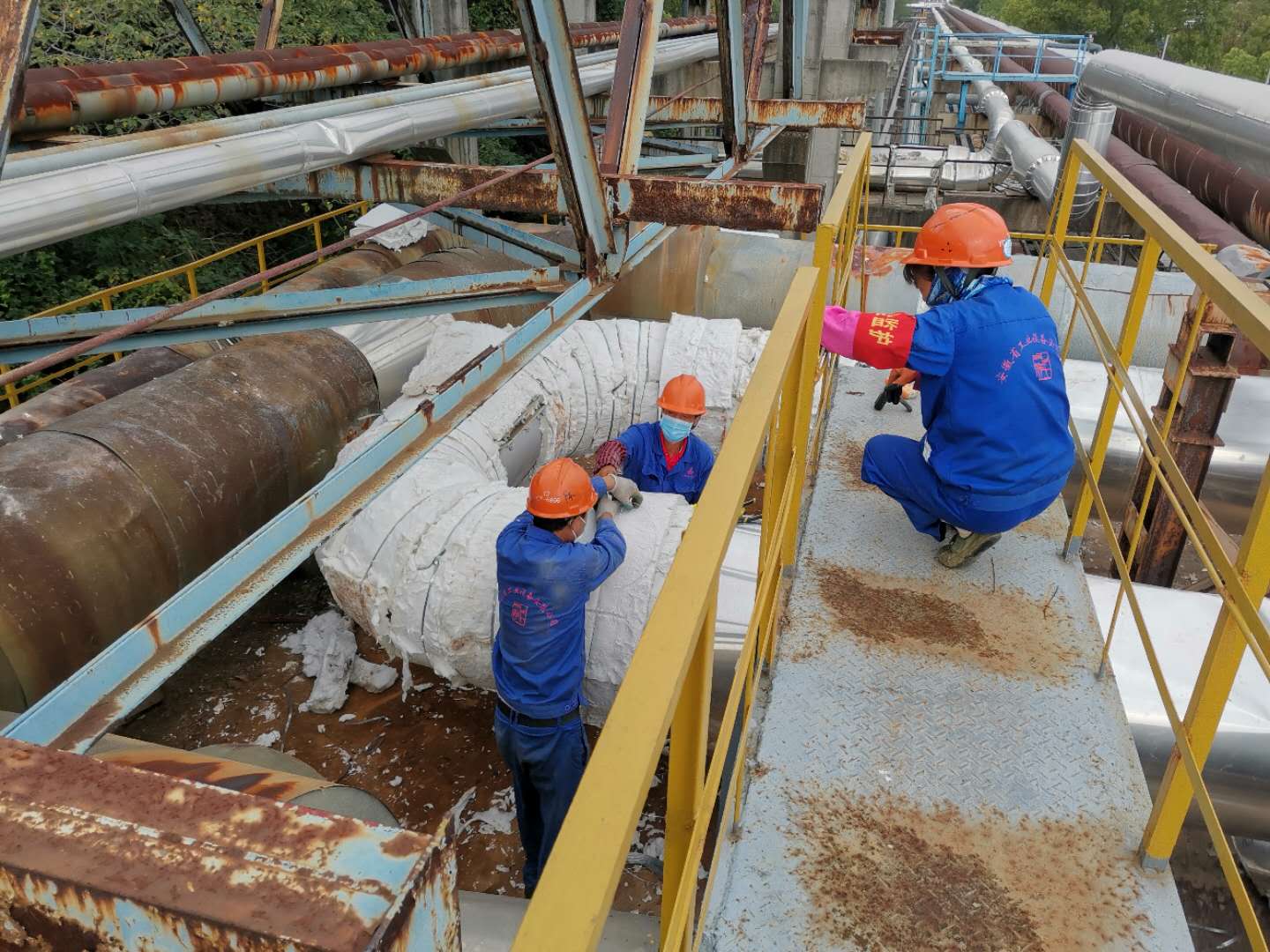 在安慶石化重污油罐尾氣治理項目上,工人們正在進行管道保溫施工工作。分段管道的保溫施工按照不同吊裝地點合適程度而定,目前采用地面管道保溫施工,完成后留出焊縫及吊點位置,待吊裝后再及時進行焊縫及吊點保溫施工工作。