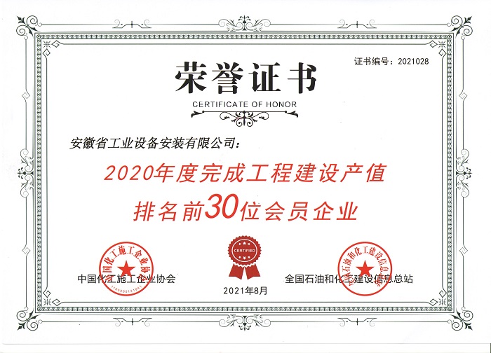 2021年4月,公司迅速行動、充分準備,通過中國化工施工企業(yè)協(xié)會管理系統(tǒng)上報企業(yè)各類資料。近日,經(jīng)過中國化工施工企業(yè)協(xié)會與全國石油和化工建設(shè)信息總站匯總評比,我公司榮膺中國化工施工企業(yè)協(xié)會2020年度工程建設(shè)產(chǎn)值排名前30位會員企業(yè)。