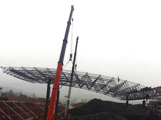 當(dāng)日上午9時整,隨著吊裝負(fù)責(zé)人一聲令下,一臺75T汽車吊作為主吊吊起鋼網(wǎng)架一端,兩臺25T汽車吊做輔吊吊起鋼網(wǎng)架另一端,50噸的大鋼網(wǎng)架徐徐升起,經(jīng)過調(diào)整、就位、固定,鋼網(wǎng)架終于穩(wěn)穩(wěn)地落在高高的鋼柱上,整個吊裝過程歷時不到1小時就安全完成。吊裝的科學(xué)合理安排、進展的有序組織得到業(yè)主和監(jiān)理的贊許。