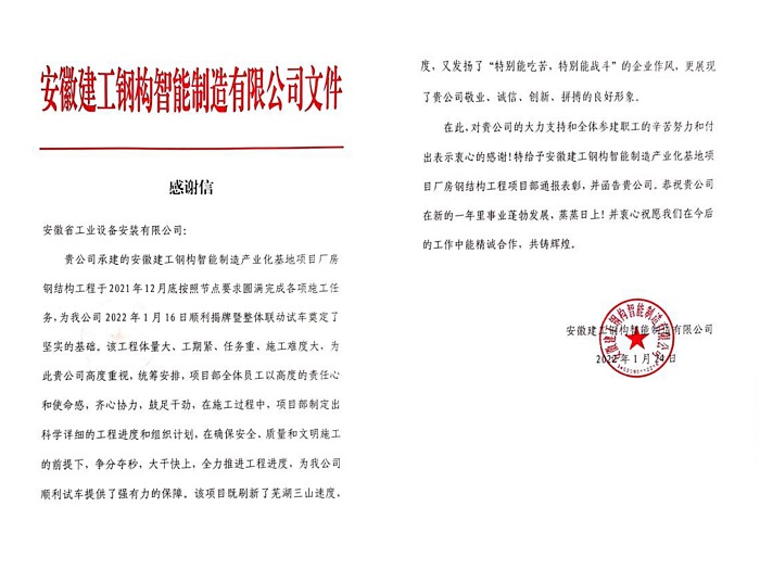 近日,公司安徽建工鋼構(gòu)智能制造有限公司廠房鋼結(jié)構(gòu)工程項(xiàng)目收到業(yè)主單位安徽建工鋼構(gòu)智能制造有限公司感謝信,信中對建工鋼構(gòu)廠房鋼結(jié)構(gòu)工程項(xiàng)目部在工程施工中的辛苦努力和突出表現(xiàn)表達(dá)了高度贊譽(yù)和衷心感謝!