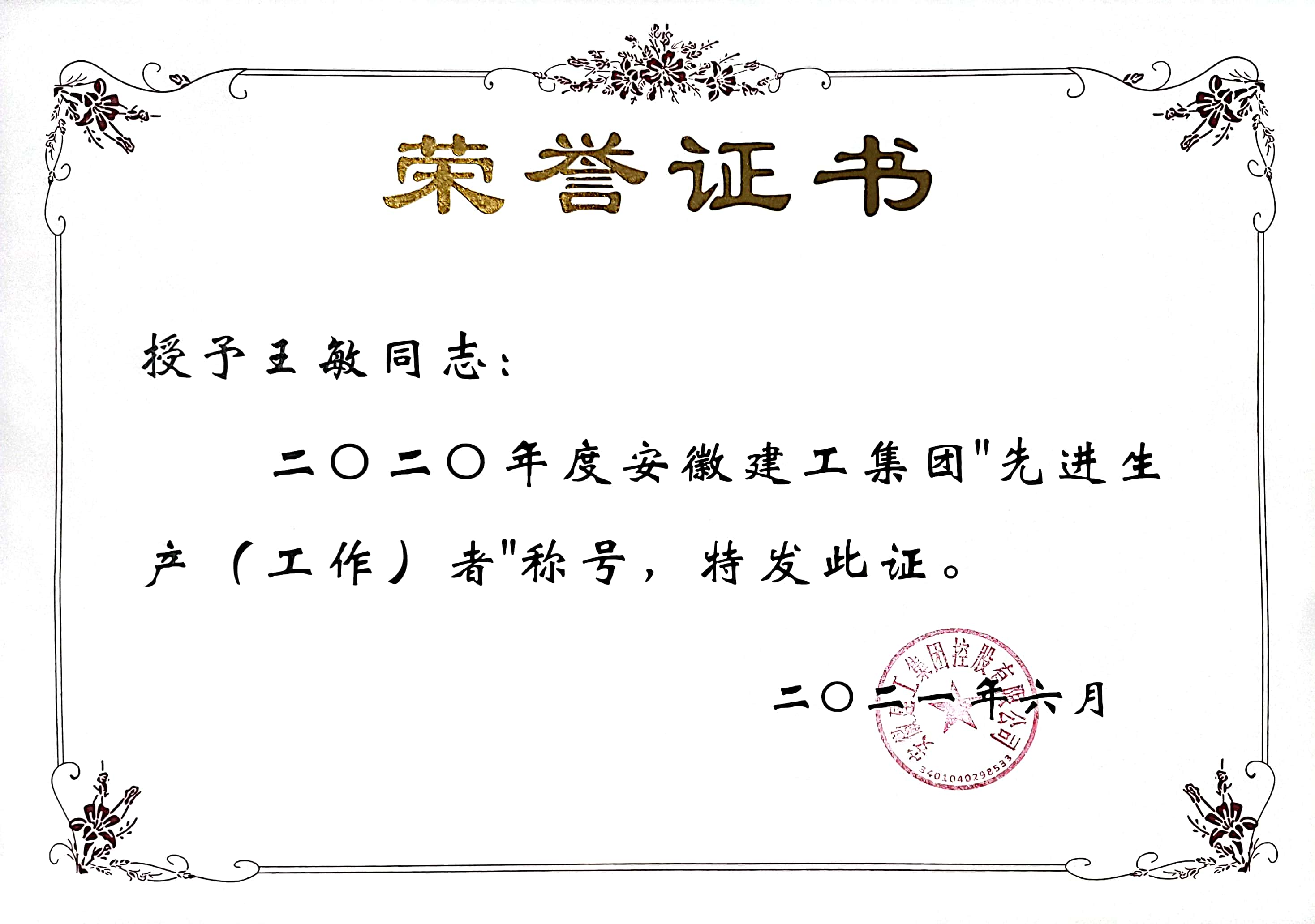 在工作作風(fēng)上,王敏一貫堅(jiān)持對自己高標(biāo)準(zhǔn)嚴(yán)要求,腳踏實(shí)地,勤奮敬業(yè),認(rèn)真細(xì)致,勤于思考,盡心盡責(zé),主動(dòng)、積極地做好每一項(xiàng)工作,認(rèn)真履行崗位職責(zé)。她時(shí)常告誡自己要以德服人,以身作則,并在實(shí)際工作中努力實(shí)踐著這一思想 ,注重自己的一言一行,公正、客觀,一切從大局出發(fā),不謀私利,不圖己便,廉潔自律,做到自重、自省、自警和自勵(lì)。2021年,王敏由于出色的工作成績,被評為“安徽建工集團(tuán)2020年度先進(jìn)生產(chǎn)(工作)者”,她說,這是集團(tuán)對她過去工作的肯定,也是對她未來工作的要求。