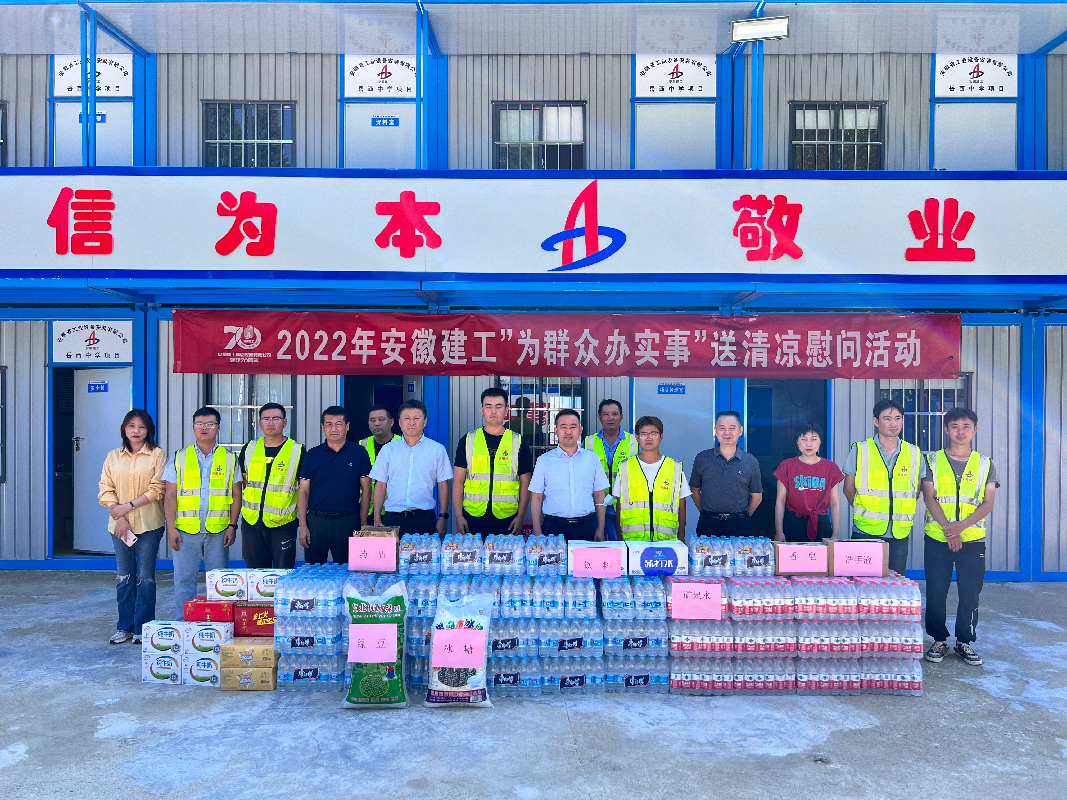 7月15日,建工股份黨委委員、副總經(jīng)理黃代赴安徽安裝岳西中學建設(shè)項目宣貫建工控股第一次黨代會精神暨開展“為群眾辦實事”送清涼慰問活動,安徽安裝公司黨委書記、董事長胡六中參加慰問。