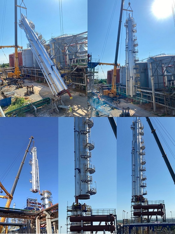 陣陣轟鳴聲中,汽提塔上段在兩臺(tái)500噸、160噸吊車的默契配合下緩緩升高,直至完全吊離鞍座。15時(shí)48分,汽提塔上段豎立,溜索摘除,由主吊車穩(wěn)步吊向汽提塔下段上方,對(duì)準(zhǔn)接口慢慢落下,工人師傅立即上前組對(duì)點(diǎn)口,16時(shí)12分點(diǎn)口完成。為爭(zhēng)取寶貴時(shí)間,項(xiàng)目部實(shí)行管理人員輪班制、班組夜間倒班制,通宵焊接作業(yè),于次日中午時(shí)分完成組對(duì)焊接。為保證組對(duì)質(zhì)量,剛焊接完的汽提塔上段還要被吊車“提拎著”靜置12小時(shí)以上。最終在8月7日7時(shí)48分,隨著主吊車緩緩摘鉤,安慶石化200噸/時(shí)污水汽提裝置項(xiàng)目重要節(jié)點(diǎn)——汽提塔上段空中組對(duì)完美收官,整個(gè)過程歷經(jīng)40個(gè)小時(shí)。