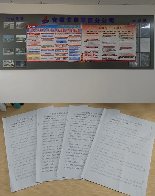 為抓好抓實(shí)黨的二十大精神的學(xué)習(xí)宣傳貫徹工作,近期,陜西分公司黨支部以“三會(huì)一課”、職工大會(huì)的形式組織開(kāi)展黨員干部職工學(xué)習(xí)黨的二十大精神學(xué)習(xí)研討會(huì);分公司開(kāi)展“學(xué)習(xí)宣貫黨的二十大”知識(shí)答題活動(dòng),以考促學(xué),以學(xué)促知,以知促用,充分檢驗(yàn)學(xué)習(xí)效果;通過(guò)制作黨的二十大精神宣傳圖,開(kāi)展立體式廣泛宣傳,推動(dòng)大會(huì)精神深入職工群眾;通過(guò)開(kāi)展一系列特色學(xué)習(xí)教育與宣傳活動(dòng),切實(shí)把黨的二十大精神帶到職工群眾身邊,為提高黨員干部職工對(duì)黨的二十大精神的全面掌握與學(xué)習(xí)起到促進(jìn)作用,使黨的二十大精神成為分公司各項(xiàng)工作發(fā)展的思想與行動(dòng)綱領(lǐng)。