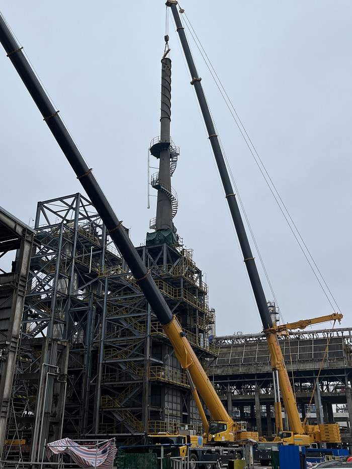 該項(xiàng)目原有煙囪吊耳主軸低于規(guī)范要求,存在安全隱患,因此在本次檢修期間重新制作并利用吊籠在高空焊接安裝吊耳。該煙囪及附件整體重約50噸,設(shè)備位于25米框架頂,煙囪長35米,煙囪頂部距地面60米,受施工空間影響,采用動(dòng)態(tài)施工的組織方法,利用500T吊車主吊與130T吊車溜尾、高空組對(duì)焊接及分段吊裝等技術(shù)確保該煙囪順利吊裝。