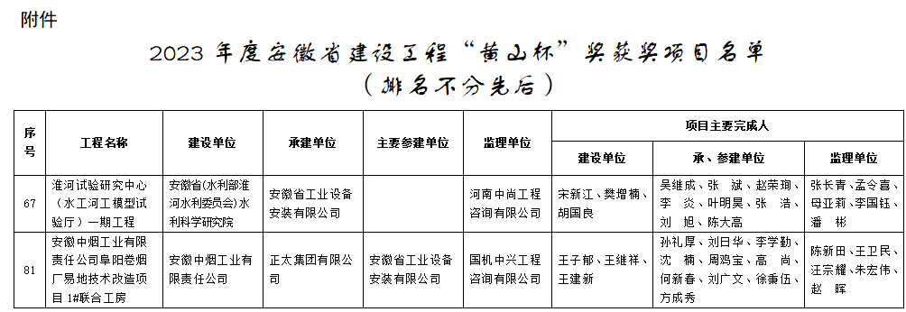 7月25日,安徽省住房和城鄉(xiāng)建設廳 、安徽省交通運輸廳、安徽省水利廳聯(lián)合發(fā)布《關(guān)于公布2023年度安徽省建設工程“黃山杯”獎獲獎項目名單的通知》,由建工安裝集團蚌埠分公司承建的“淮河試驗研究中心(水工河工模型試驗廳)一期工程”和參建的“安徽中煙工業(yè)有限責任公司阜陽卷煙廠易地技術(shù)改造項目1#聯(lián)合工房”等2個項目均獲2023年度安徽省建筑行業(yè)建設工程質(zhì)量最高榮譽獎“黃山杯”。其中“淮河試驗研究中心(水工河工模型試驗廳)一期工程”是建工安裝公司首次作為承建單位獲此殊榮;“安徽中煙工業(yè)有限責任公司阜陽卷煙廠易地技術(shù)改造項目1#聯(lián)合工房”項目同時正在申報國家級安裝行業(yè)最高獎項中國安裝工程優(yōu)質(zhì)獎(安裝之星),5月份預檢已通過,等待9月復檢。兩個項目作為承建和參建單位一舉捧得2樽“黃山杯”,也是蚌埠分公司歷史首次,同時也是蚌埠分公司近年來捧得的第5、第6樽“黃山杯”獎項。