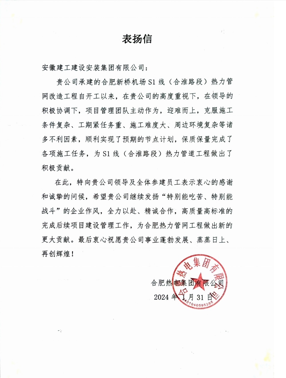 1月31日,合肥熱電集團有限公司發(fā)來表揚信,就建工安裝集團對合肥新橋機場S1線(合淮路段)熱力管網(wǎng)改造工程做出的積極貢獻予以充分肯定和真摯謝意。