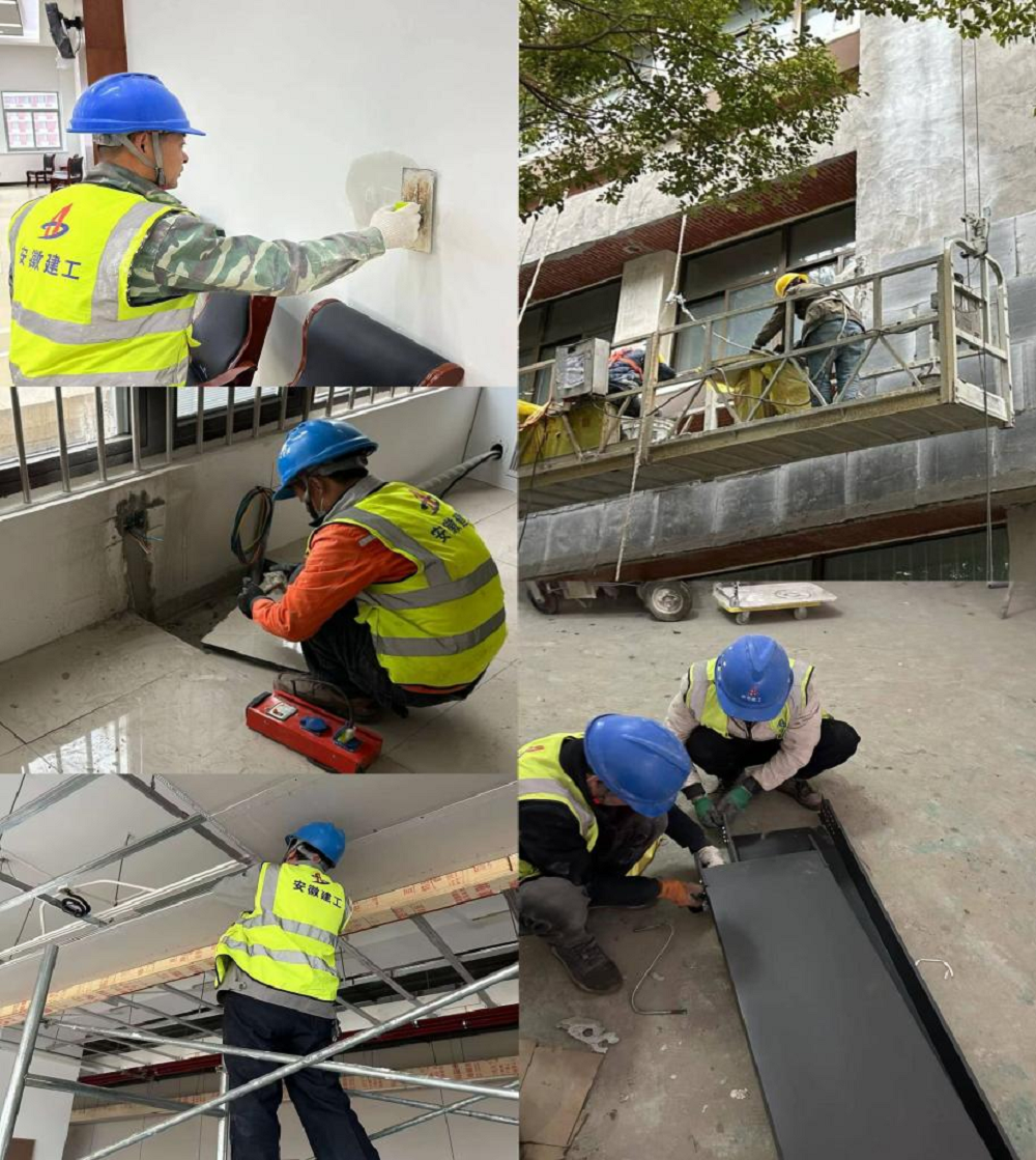 建工安裝滁州分公司安徽理工大學維修改造項目(二期)位于合肥市長豐縣雙鳳路與鳳霞路交口,施工內容主要為對已有實訓樓、產教融合樓、綜合服務中心、生活服務次中心四個單體合計約3萬平方米的維修、改造、安裝以及室外附屬工程給排水、景觀、鋪裝、綠化等。目前,通過項目全體員工夜以繼日、分秒必爭的奮斗,生活服務次中心已基本完工,實訓樓施工完成約60%,產教融合樓施工完成約70%,綜合服務中心完成約75%,外墻真石漆及屋面保溫完成約50%。