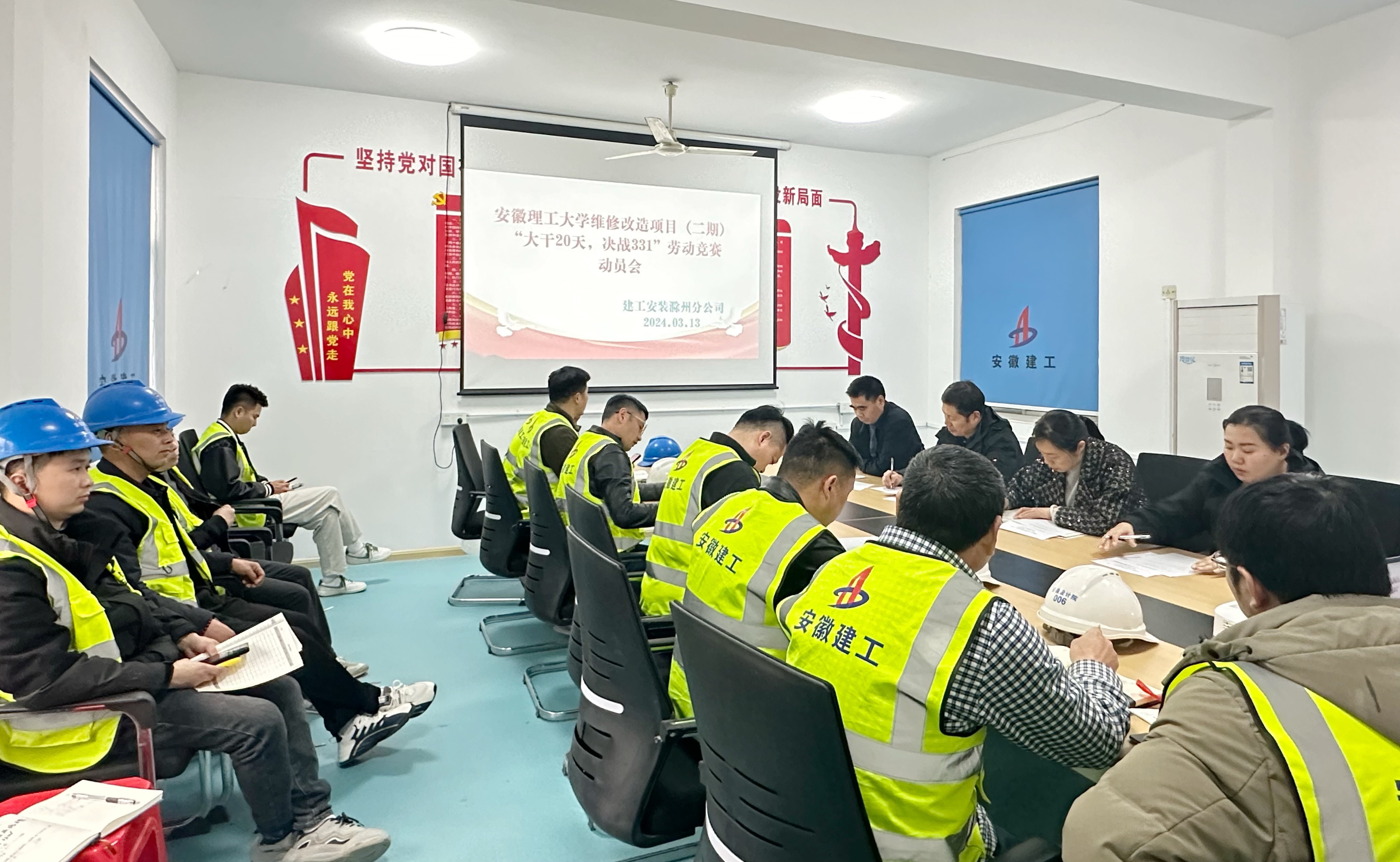 為深入學(xué)習(xí)貫徹集團(tuán)三屆一次職代會(huì)暨2024年工作會(huì)議和公司十七屆四次職代會(huì)精神,全面落實(shí)“項(xiàng)目管理強(qiáng)化年”工作部署和集團(tuán)2024年度“當(dāng)好主人翁建功大發(fā)展”勞動(dòng)競(jìng)賽活動(dòng)相關(guān)要求,3月13日下午,滁州分公司安徽理工大學(xué)維修改造(二期)項(xiàng)目在項(xiàng)目部現(xiàn)場(chǎng)召開(kāi)了“大干20天、決戰(zhàn)3.31”勞動(dòng)競(jìng)賽動(dòng)員會(huì)。分公司黨支部書(shū)記、副經(jīng)理程茂麗,副經(jīng)理張漢軍等勞動(dòng)競(jìng)賽領(lǐng)導(dǎo)小組成員出席會(huì)議,項(xiàng)目部全體管理人員及施工班組代表參會(huì)。