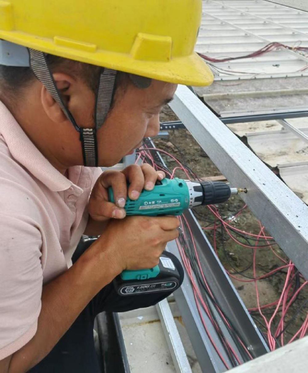 圖為工人使用電動螺絲刀安裝逆變器支架