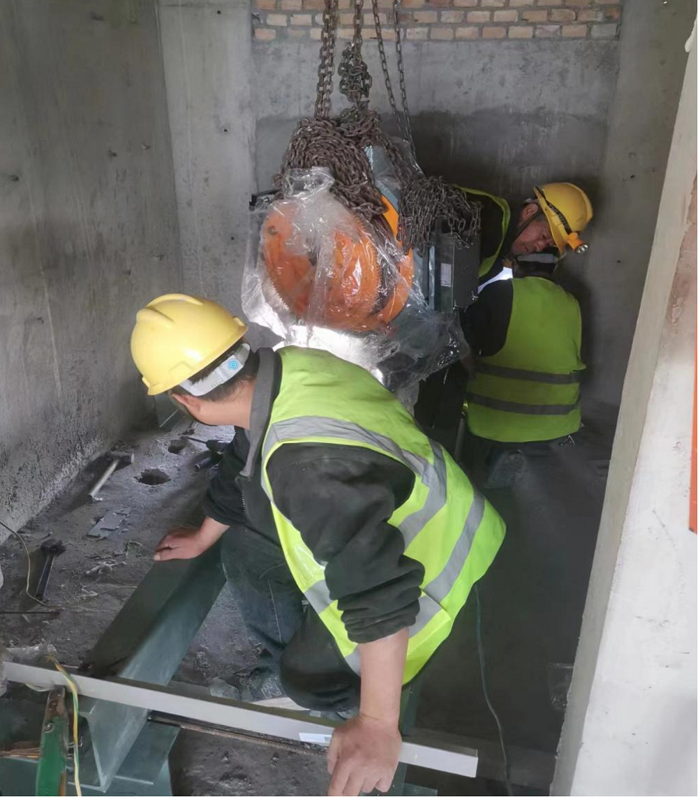 蚌埠和順天宸攬境項(xiàng)目現(xiàn)場(chǎng)安裝人員正在機(jī)房?jī)?nèi)安裝主機(jī)及擱機(jī)梁