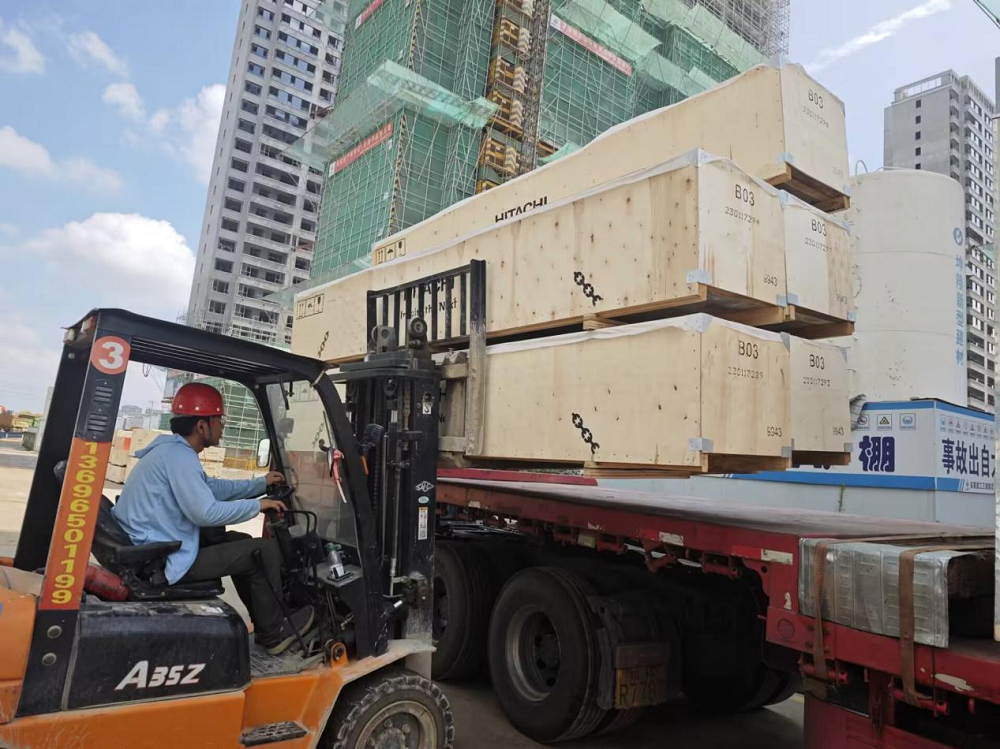 派河印象·杏語林溪項(xiàng)目施工人員正在給到場(chǎng)電梯卸貨