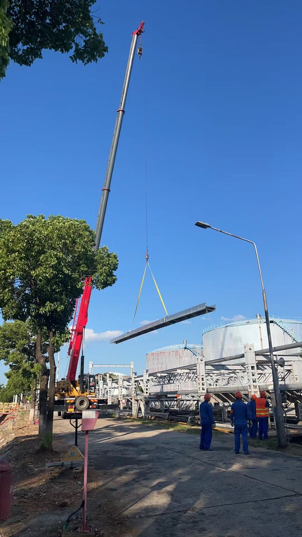 8月1日,該項(xiàng)目進(jìn)行電纜槽盒托架吊裝工作,該電纜槽盒托架采用18米每段進(jìn)行吊裝,先集中預(yù)制后到現(xiàn)場(chǎng)管廊處進(jìn)行對(duì)接后在吊裝至管廊上。該托架重量約0.6噸,使用1臺(tái)25噸吊車,將整段托架吊至上方,并對(duì)接安裝連接成一個(gè)整體。在項(xiàng)目部全體人員的共同努力下托架順利吊裝到位,該托架吊裝完成標(biāo)志著此項(xiàng)目安裝工作進(jìn)入尾聲,為項(xiàng)目按時(shí)完工奠定了良好的基礎(chǔ),目前正在進(jìn)行電纜橋架吊裝和電纜鋪設(shè)工作。