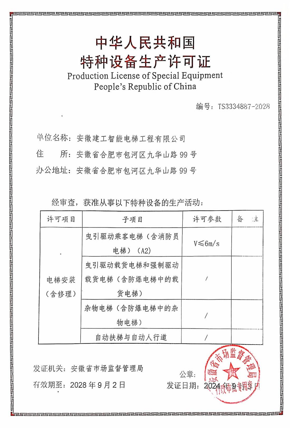 近日,經(jīng)安徽省市場監(jiān)督管理局核準(zhǔn),安徽建工智能電梯工程有限公司順利取得特種設(shè)備生產(chǎn)許可證,喜獲電梯安裝(含修理)A2級資質(zhì)。