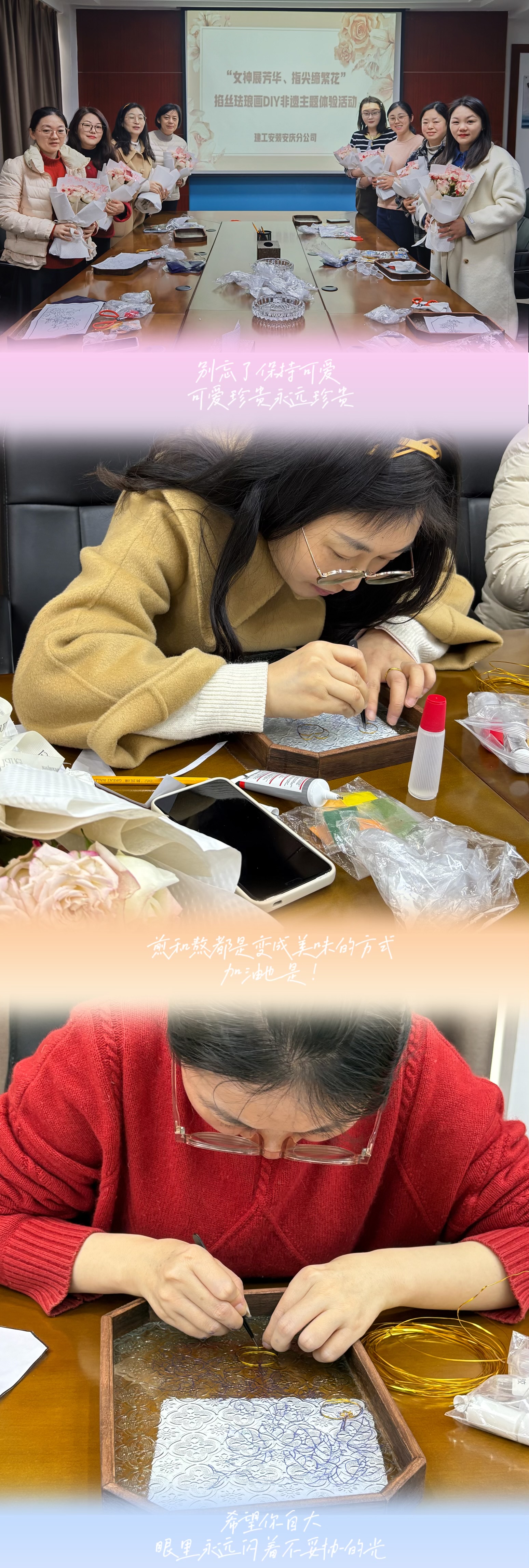 一年一度春風暖,如詩如畫三月天。在第115個“三八”國際勞動婦女節(jié)來臨之際,為豐富女職工的文化生活,激發(fā)女職工干事創(chuàng)業(yè)的工作熱情,增強女性職工歸屬感、幸福感,建工安裝安慶分公司于3月7日開展“女神展芳華、指尖締繁花”掐絲琺瑯畫DIY非遺主題體驗活動,讓大家感受傳統(tǒng)文化魅力和工匠精神。