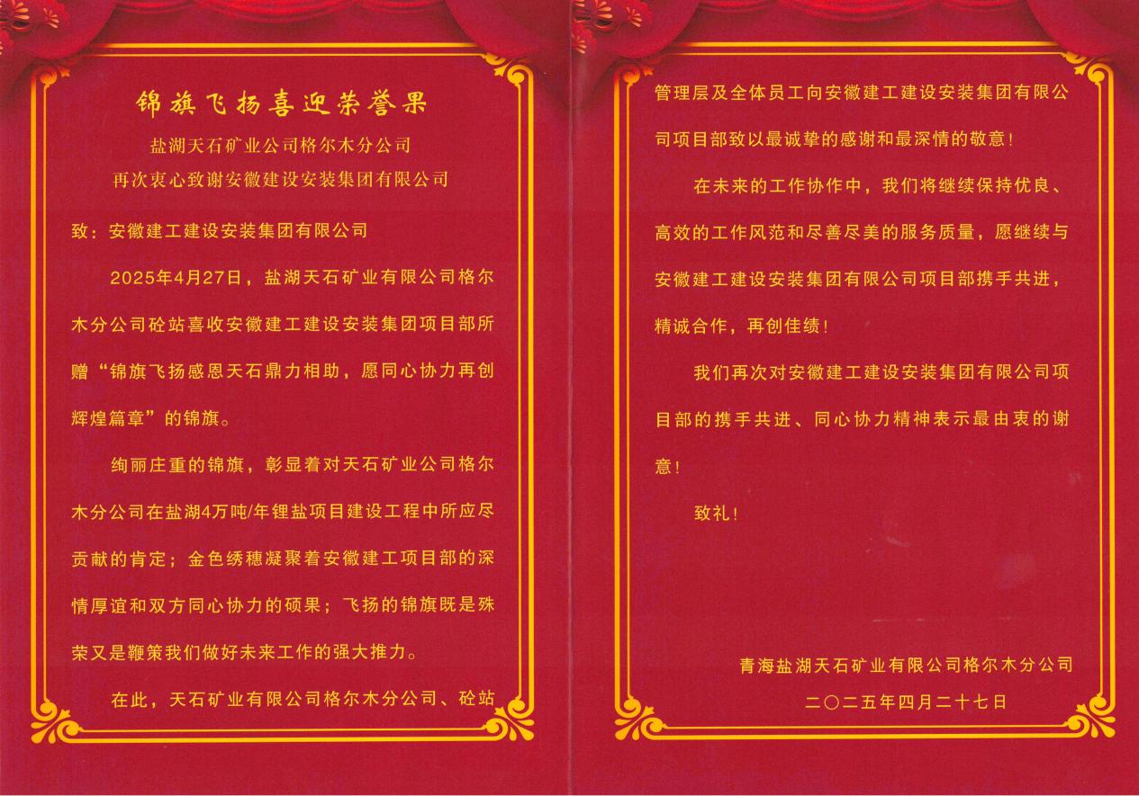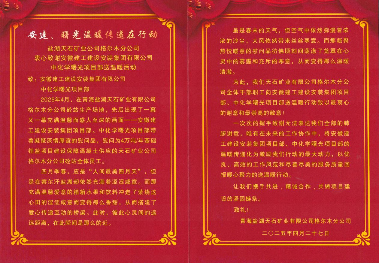信中,青海鹽湖天石礦業(yè)有限公司格爾木分公司對建工安裝項(xiàng)目部此前慰問砼站全體員工致以最誠摯的感謝,愿繼續(xù)與建工安裝項(xiàng)目部攜手共進(jìn)、精誠合作、再創(chuàng)佳績!這封感謝信不僅是對項(xiàng)目部過往成績的肯定,更是一份振奮人心的激勵。建工安裝將繼續(xù)保持高昂斗志和嚴(yán)謹(jǐn)態(tài)度,加強(qiáng)與相關(guān)單位溝通協(xié)作,強(qiáng)化項(xiàng)目管理,確保項(xiàng)目按期、高質(zhì)量交付,為打造世界級鹽湖提鋰產(chǎn)業(yè)基地貢獻(xiàn)力量!