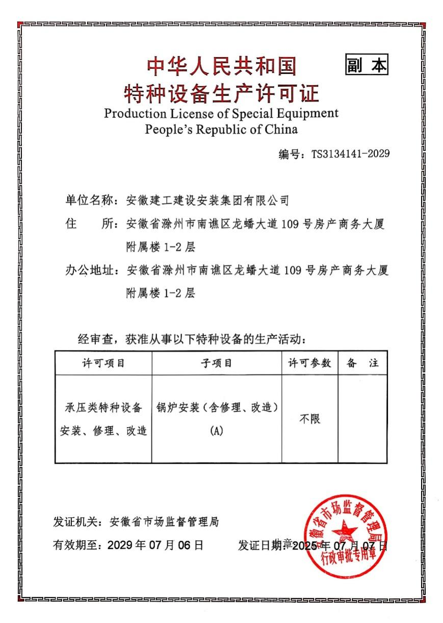 近日,建工安裝“承壓類特種設備安裝、修理、改造—鍋爐安裝(含修理、改造)(A)”新證申報工作順利通過安徽省特種設備檢測院等各方的評審核查,現(xiàn)已取得安徽省市場監(jiān)督管理局頒發(fā)的新證。